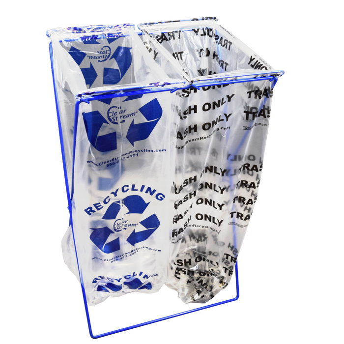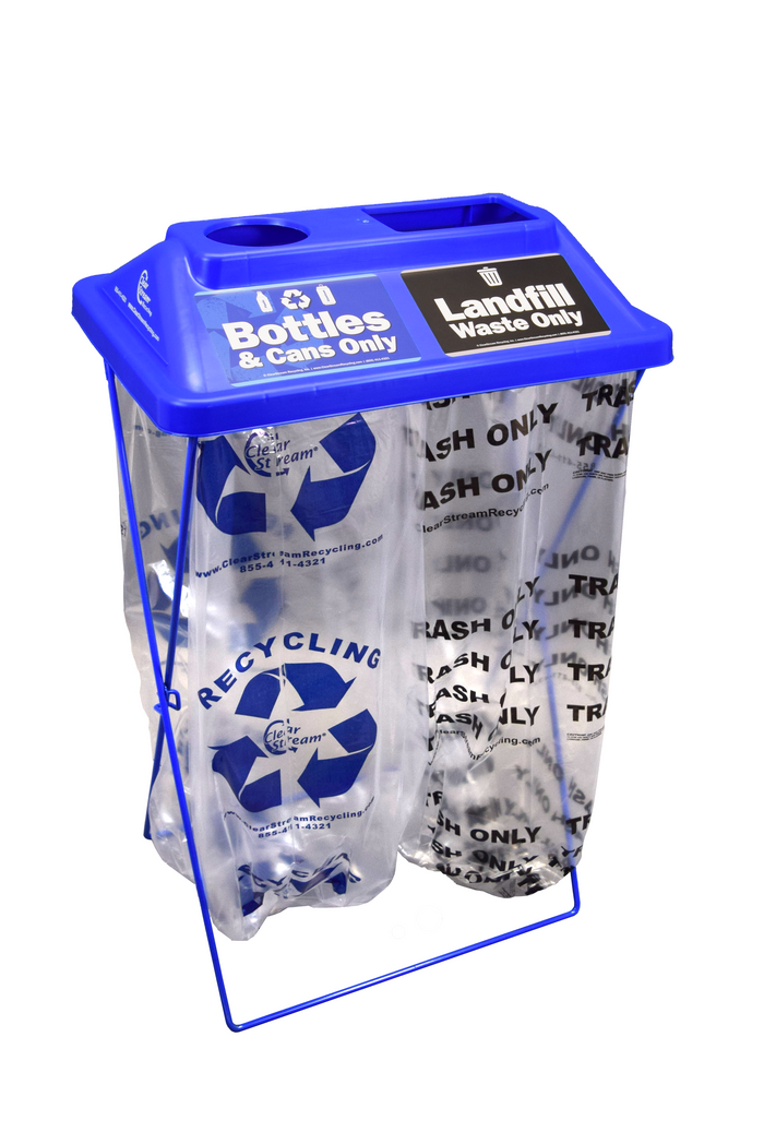 ClearStream Portable DualStream containers use an innovative folding design to reduce logistics costs. Folding, heavy-duty, 3/8 inch frames are easy to transport, set up, service and store. Portable bins utilize connectors, transporters and sign displays – both indoors and outdoors – to help customers achieve maximum diversion with streamlined operations. DualStream bins have two separate bag locks on single frame allowing you to collect two separate materials. Unlike many public space containers, portable bins are never out of service. DualStream frames and bin accept the DualStream 25 gallon bags. Tie off the bags when they are full, add new bags to the bag locks.